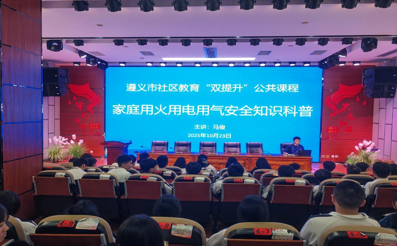 10月23日,遵义市应急救援大队中队长马俊走进余庆县子营街道,开展“家庭用火用电用气安全知识科普”社区教育“双提升”公共课程,为48名中等职业学校学生带来了一堂实用的安全防护课,筑牢安全防线。讲座结合典型事故案例,用通俗易懂的语言拆解安全隐患,互动环节中马队长对灭火器“提、拔、握、压”操作要领进行现场示范,展示灭火器压力表的判断方法,同时强调要“保持3米安全距离,呈扫射式推进灭火”,让学生直观掌握灭火器使用要点,提升个人应急处置能力。