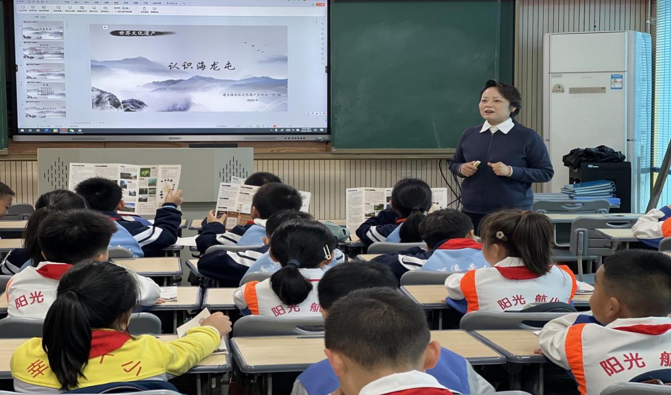 2025年10月21日,遵义海龙屯文化遗产管理局走进汇川区航天小学教育集团,向来自航小、汇川五小、汇川十小、汇川十四小、重庆路小学的同学们讲解海龙屯出土文物、历史故事及世遗价值,进一步发挥世界文化遗产在思政教育中的基础性作用。