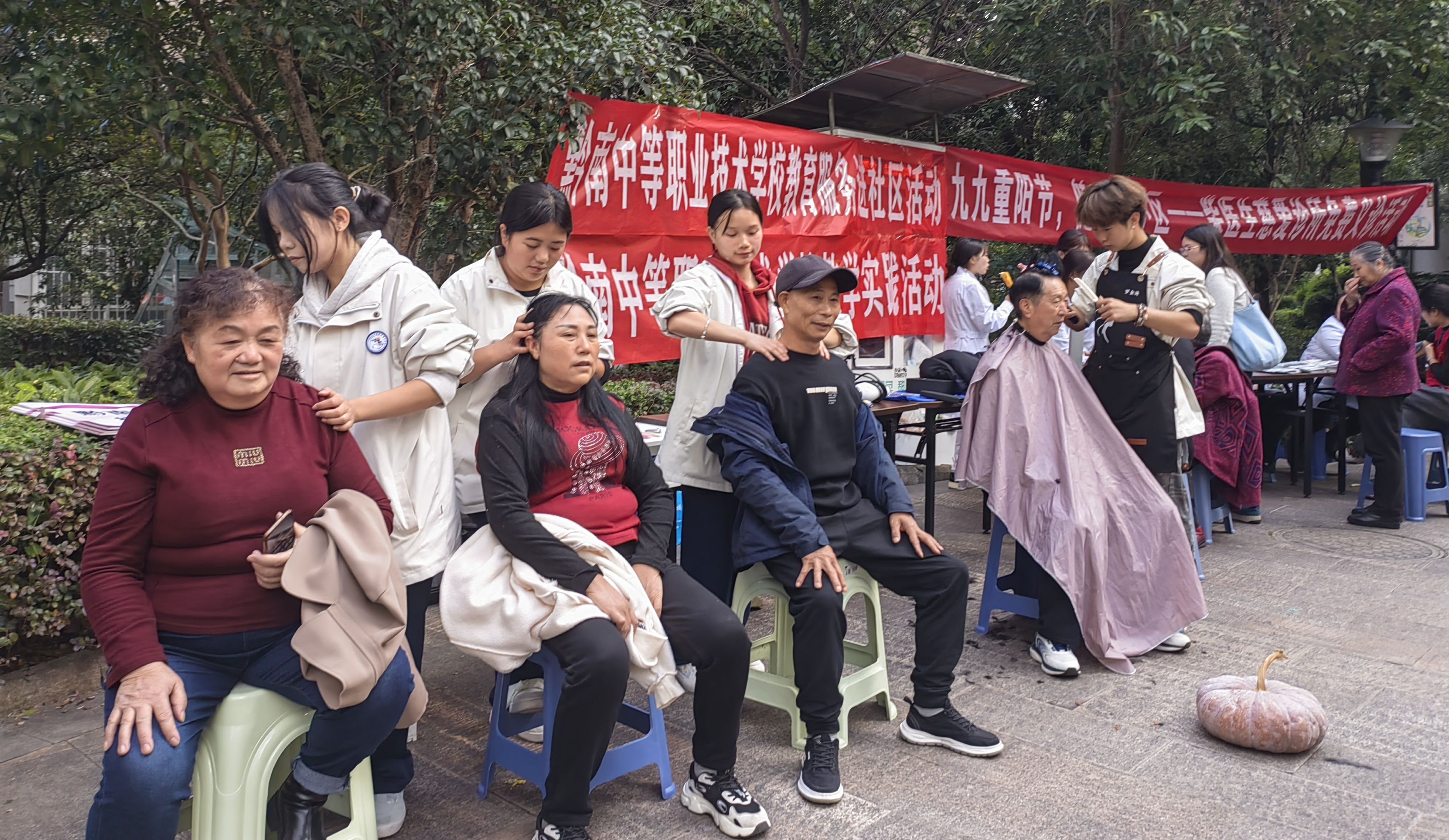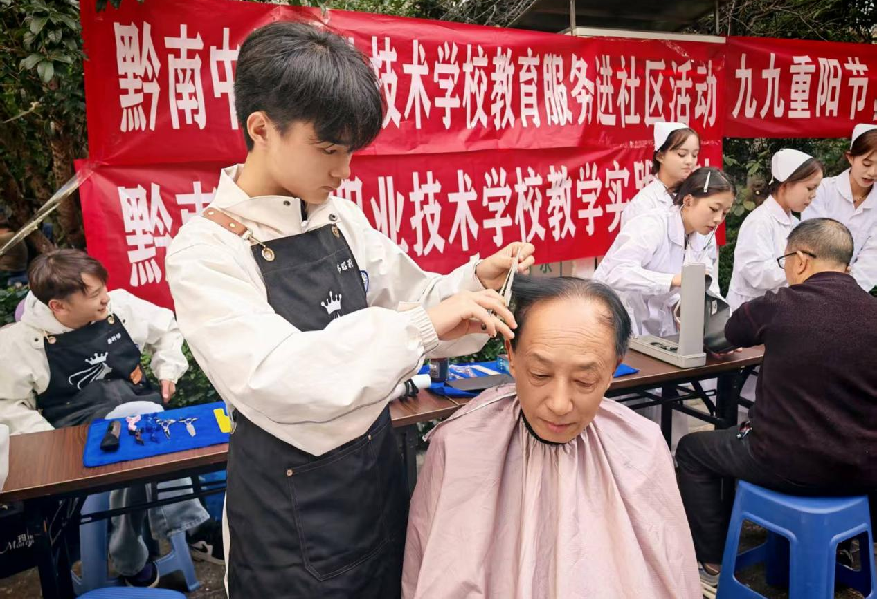 活动现场,气氛温馨而热烈。来自我校美发与形象设计专业的学生们技艺娴熟,耐心细致地为社区老年朋友们提供义剪服务。他们一边精心修剪,一边与老人们亲切交谈,周到服务赢得了老人们的连连称赞。美容美体专业的学生们则发挥所长,为老人们进行了专业的肩颈按摩和手脚部护理,细心地为他们修剪指甲,舒缓了老人们身体的疲惫,送上了贴心的关怀。