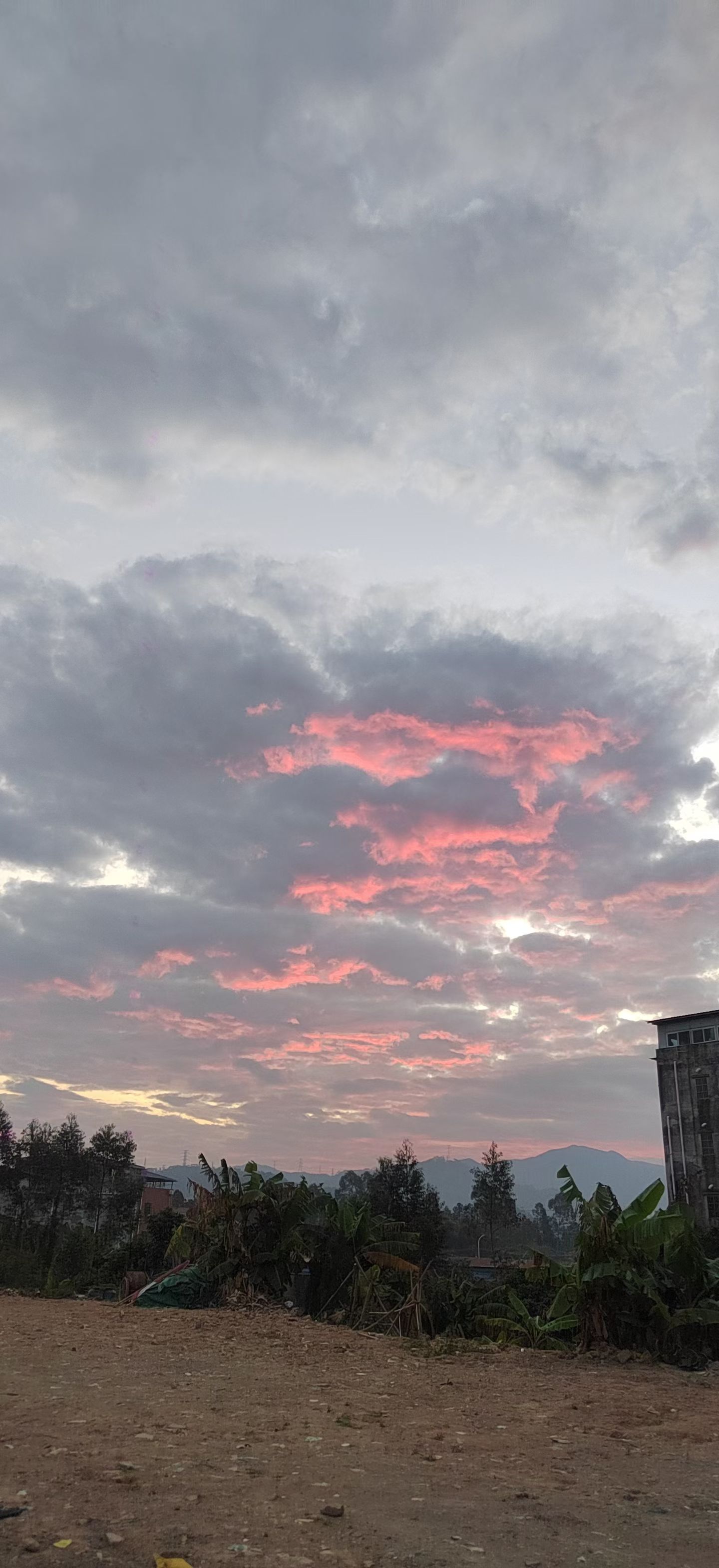 天空与云霞大面积厚重的灰云层中,穿插着粉红色的霞光带,光线透过云层缝隙晕染,形成冷暖色调的对比,是典型的晨昏时分云层受阳光折射形成的景观。